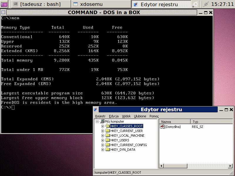 Praktyczne działanie całości (sugeruję jednak sprzętową akceleracje ;)) możemy sprawdzić grając np. w sympatyczną grę Extreme Tux Racer. DOS i Linux i Windows w jednym stali domku...Podstawowym chyba argumentem zwolenników systemów Microsoftu przeciw Linuxowi jest brak zgodności. Nie do końca jest to prawda. Najbardziej znanym pakietem pozwalającym na uruchamianie skompilowanych aplikacji Windows jest Wine (skrót "Wine Is Not an Emulator"), który próbuje zaimplementować funkcje tego systemu w środowisku X11. Jest to trudne (co widać po liście obsługiwanych programów w najwyższym statusie Platinum) ze względu na ilość funkcji. Powstały (ale już komercyjne) próby stworzenia doskonalszego Wine. Są one ukierunkowane np. na gry. Mówię tutaj o pakietach Cedega i CrossOver. Jest nawet pewne wsparcie dla DirectX. Mamy darmowe DOSEMU tworzące maszynę wirtualną x86 pozwalającą na pracę ze starszymi programami przeznaczonych do DOS (uruchamia ono w niej najczęściej darmową wersję systemu DOS napisaną w ramach projektu FreeDOS). Z kolei darmowy DOSBox jest emulatorem ukierunkowanym na uruchamianie gier działających w DOS.