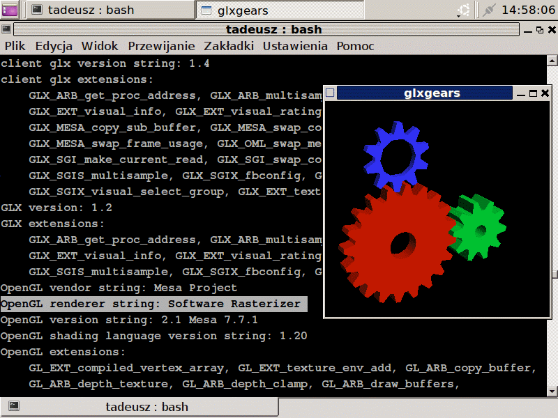 Żeby zobaczyć pomoc do jakiejś komendy, wystarczy wpisać "man nazwa_komendy". Aby z kolei zadziałała ona w tle (zanim się zakończy, my mamy znów dostęp do terminala i możliwość wydawania poleceń), na jej końcu należy dodać spację i "&". Pracę w konsoli możemy sobie ułatwić wykorzystując np. Midnight Commandera (komenda "mc") naśladującego nieśmiertelnego Norton Commandera (dla osób, którego nie kojarzą tego drugiego - jest to to rozwiązanie w stylu Total Commandera). Wspomniałem o powłokach - są bardzo różne, wiele ma swój język programowania (możliwość uruchamiania skomplikowanych skryptów). Dla ciekawych: Ubuntu standardowo proponuje powłokę bash. Środowisko graficzneRozwiązania unixopodobne mają również grafikę, czyli X Window System (częściej znane jako X11). Jego istotą jest obecność serwera (tzw. X Servera). Obsługuje on pulpit, zdefiniowane są z jego użyciem wyłącznie elementarne operacje, do niego wysyłane są np. informacje o ruchach myszki. Jest to więc klasyczna architektura klient-serwer i nie jest wielkim problemem udostępnienie pulpitu np. poprzez sieć (coś na wzór Remote Desktop z Windows). Dystrybucje Linuxa zawierają jego implementację o nazwie XFree86 albo (znacznie częściej) X.Org. Z ciekawostek: w większości dystrybucji przy włączonym środowisku graficznym mamy dalej dostęp do maksymalnie sześciu terminali (kombinacja klawiszy CTRL+ALT+F1 do CTRL+ALT+F6), a nasze środowisko zobaczymy po użyciu CTRL+ALT+F7. X11 nie definiuje styli okien albo wyglądu ich krawędzi. Robi to dodatkowy element czyli tzw. menedżer okien. Istnieje wiele różnych (np. Fluxbox, AfterStep czy Xmonad), dwoma najpopularniejszymi są obecnie KDE i Gnome (które dodatkowo zawierają aplikacje pozwalające zbudować całe środowisko graficznie jak w Windows oraz udostępniają zestawy bibliotek pozwalających programistom w prosty sposób pisać aplikacje okienkowe - odpowiednio QT i GTK+). Gnome powstaje w ramach projektu GNU. Wersja 1.0 została wydana w marcu 1999, wersja 2.0 w czerwcu 2002, obecna to 2.30. Biblioteki QT przez lata były własnością firmy Qt Development Frameworks przejętej obecnie przez Nokię (znaną z produkcji telefonów komórkowych). Obecnie są udostępnione na licencji GNU GPL. Niestety, ale KDE w wersji 4 jest dosyć mocno krytykowane ze względu na powolność, duże zużycie zasobów oraz brak stabilności. Grafika 3DNa rynku dostępne są obecnie dwa standardy związane z tworzeniem grafiki 3D: Direct3D będący częścią bibliotek DirectX (nieodłączanie związanych z Windows, zamkniętych i tworzonych przez Microsoft) oraz OpenGL (dostępny dla bardzo różnych systemów operacyjnych). Dystrybucje Linuxa zawierają najczęściej bibliotekę Mesa 3D będącą darmową implementacją OpenGL. Jest ona w stanie działać nawet, gdy w systemie nie ma działającej sprzętowej akceleracji (poniżej przykładowe demo "glxgears" i wynik komendy "glxinfo" z zaznaczonym fragmentem wskazującym na użycie programowego sterownika). Nawiasem mówiąc Windows ma podobne rozwiązanie dopiero wraz z siódemką (tzw. WARP10).
