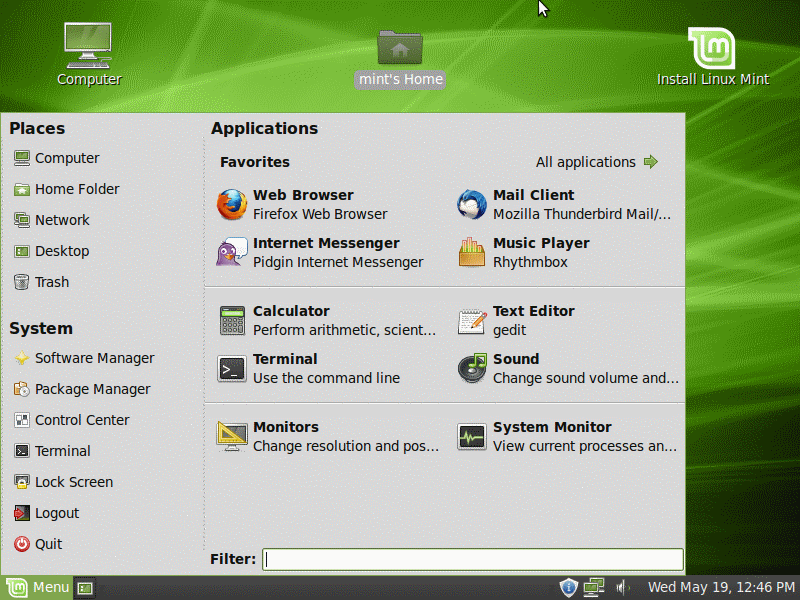 App Store Categories Acer (5) AMD (14) Android (84) APN (5) Apple (31) App Store (6) benchmark.pl (19) chip.pl (7) CHM (5) Chrome (5) dobreprogramy.pl (95) drogowe (40) English (139) English article (23) English blog (108) EPUB (7) Firefox OS (3) Fizyka (4) Gammu (62) Gammu+ (49) GSM (151) Hyperbook (13) ISTQB (3) jQuery (3) jQuery Mobile (3) książka 1 (6) książka 4 (97) License (4) Linux (36) Linux+ (1) modern_laptop (1) MyGnokii (6) Nokia (30) NTFS (2) OS (41) PDF (5) poczytaj (1) poem (3) Polski (233) polski (239) Polski artykuł (58) polski blog (238) Polski blog (176) rysunki (2) S.F. (14) salon24.pl (180) Sobieski (8) Spider's Web (17) Straż (7) Tizen (5) TrueFenix (4) Ubuntu (8) Vista (5) WAT (1) wiersz (94) Windows (61) Windows 7 (11) x86 (122) Top 10 N82 review (2008) (203533) Przepisy drogowe (2012-2021) (158605) English articles and files (150787) Polskie artykuły i pliki (147515) Timeline 2026-04 (1) 2026-02 (3) 2026-01 (2) 2025-11 (1) 2025-07 (1) 2024-12 (1) 2024-08 (1) 2024-01 (1) 2023-12 (1) 2023-11 (1) 2023-03 (5) 2023-02 (1) 2023-01 (13) 2022-12 (9) 2022-11 (10) 2022-10 (12) 2022-09 (14) 2022-08 (4) 2022-07 (3) 2022-06 (4) 2022-05 (3) 2022-04 (9) 2022-03 (11) 2022-02 (9) 2022-01 (5) 2021-12 (6) 2021-11 (13) 2021-10 (11) 2021-09 (11) 2021-08 (4) 2021-07 (5) 2021-06 (12) 2021-05 (3) 2021-04 (4) 2021-03 (4) 2021-02 (5) 2021-01 (4) 2020-12 (4) 2020-11 (5) 2020-10 (1) 2020-09 (9) 2020-08 (5) 2020-07 (2) 2020-06 (1) 2020-05 (6) 2020-04 (3) 2020-03 (2) 2020-02 (2) 2020-01 (8) 2019-12 (2) 2019-11 (11) 2019-10 (1) 2019-09 (3) 2019-06 (1) 2019-05 (1) 2017-12 (2) 2017-11 (2) 2017-10 (2) 2016-01 (1) 2015-09 (2) 2015-08 (1) 2015-06 (1) 2015-05 (1) 2015-04 (1) 2015-03 (2) 2015-01 (1) 2014-10 (1) 2014-09 (2) 2014-07 (2) 2014-06 (5) 2014-05 (7) 2014-04 (3) 2014-03 (9) 2014-02 (5) 2014-01 (8) 2013-12 (7) 2013-11 (4) 2013-10 (10) 2013-09 (5) 2013-08 (9) 2013-07 (5) 2013-06 (1) 2013-05 (2) 2013-04 (3) 2013-02 (3) 2013-01 (7) 2012-12 (5) 2012-11 (5) 2012-10 (7) 2012-09 (2) 2012-08 (2) 2012-07 (2) 2012-06 (1) 2012-05 (2) 2012-04 (4) 2012-03 (6) 2012-02 (2) 2012-01 (3) 2011-12 (1) 2011-11 (1) 2011-04 (2) 2011-02 (2) 2011-01 (3) 2010-12 (5) 2010-11 (1) 2010-10 (2) 2010-08 (1) 2010-07 (2) 2010-06 (3) 2010-05 (9) 2010-04 (11) 2010-03 (14) 2009-12 (4) 2009-11 (2) 2009-10 (2) 2009-05 (1) 2009-03 (1) 2009-02 (1) 2009-01 (1) 2008-07 (1) 2008-05 (1) 2008-04 (1) 2007-12 (3) 2007-11 (2) 2007-10 (2) 2007-09 (3) 2007-08 (1) 2007-07 (2) 2007-06 (4) 2007-05 (4) 2007-04 (2) 2007-03 (5) 2007-02 (3) 2007-01 (6) 2006-12 (5) 2006-11 (5) 2006-10 (4) 2006-09 (2) 2006-08 (1) 2006-07 (6) 2006-06 (3) 2006-05 (2) 2006-04 (5) 2006-02 (1) 2006-01 (2) 2005-12 (1) 2005-09 (1) 2005-07 (1) 2003-11 (1) 2003-09 (5) 2002-11 (2) 2002-10 (14) 2001-07 (1) 2001-05 (2) 2001-01 (1) 2000-10 (1) 2000-07 (1) 2000-06 (1) 2000-03 (1) 1999-06 (2) 1999-04 (2) | Miętowe Ubuntu smak numer 9 (wersja beta, 2010) Polski Linux Polski artykuł OS x86 29 kwietnia pojawiło się Ubuntu 10.04 (o tej dystrybucji pisałem krótko tutaj), a 18 maja oparte na nim Linux Mint 9 o kodowej nazwie "Isadora". Czym się różnią ? InstalacjaNa stronie Download dostępne jest "tylko" 8 wersji (Live CD, Live DVD, wersja dla producentów komputerów i użytkowników z USA/Japonii - każda 32 i 64-bitowa). Pobrałem 32-bitową Live CD i po uruchomieniu z niej komputera zobaczyłem następujący pulpit (na obrazku poniżej pokazany z rozwiniętym menu Start):