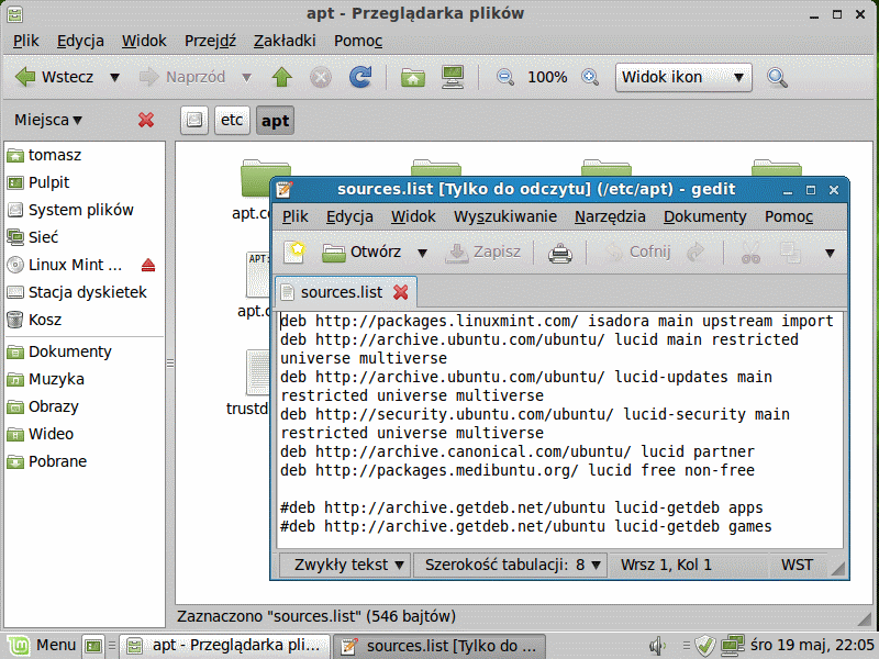 Całość jest oparta na GNOME, widać tutaj (i dalej) pewne podobieństwa do obecnych Windows (Vista i 7) - chociażby menu Start, ikonki sieci przy zegarku (ta od sieci nie jest animowana), itd. Po zainstalowaniu poprawek i zmianie kolorów (nie do końca odpowiadała mi czarna barwa menu okienek) można było przystąpić do testowania... Jest też opcja alternatywna - z płyty pod Windows należy uruchomić plik min4win.exe, podać dane takie jak hasło użytkownika czy wielkość dysku (którą chcemy przeznaczyć na Minta), a zainstaluje on się nam jak zwykła aplikacja okienkowa (widoczna w "Dodaj/Usuń programy" oraz menu startowym systemu Microsoftu). Dzięki tej opcji możemy zapoznać się z tym rozwiązaniem bez potrzeby partycjonowania dysku ! (podobna opcja jest dostępna w przypadku niektórych wersji Ubuntu). Jedyne dwa minusy - operacje dyskowe mogą być wolniejsze (co jest wyraźne wskazane przez producenta) oraz brak jest partycji, na której posadzono pliki Linuxa (to zauważyłem u siebie). WsparcieDystrybucja (podobnie jak Ubuntu w wersji na komputery osobiste) jest wspierana do kwietnia 2013. Obie są oparte na Debianie (jego formacie plików instalacyjnych dla programów, itp.), Mint w ogóle korzysta z repozytoriów Ubuntu (na załączonym obrazku zawartość pliku /etc/apt/sources.list, który określa źródła w dystrybucjach GNU/Linux wykorzystujących paczki Debiana):