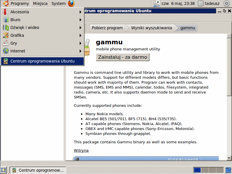 Inne programyKilka liczb: jądro jest w wersji 2.6.32, KDE 4.4.2, Gnome 2.30, Firefox 3.6.3, OpenOffice 3.2.0. Wszystkie w miarę nowe, a Ubuntu oczywiście dba o automatyczne aktualizacje :) Gdy chcemy więcej: instalacja dodatków do Firefoxa nie różni się od tego co znamy w Windows - Flash Player, Ad-Block czy nawet Silverlight (implementowany przez Moonlighta) to kwestia kilku kliknięć myszy. Przy braku Midnight Commandera w terminalu system wskazał mi, jaką komendą go dodać. Z kolei OpenOffice standardowo nie był spolszczony - trzeba było tylko wejść w systemowe menu "Języki", a brakujący dodatek został zaproponowany. Mamy też Centrum Oprogramowania Ubuntu. Znalazłem w nim np. "swoje" Gammu.