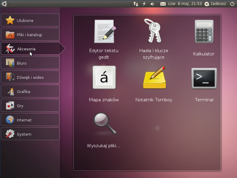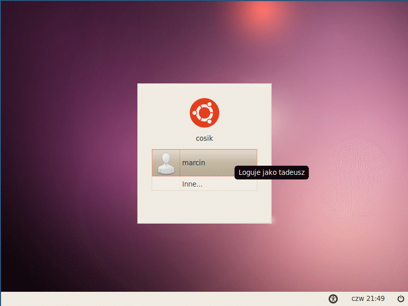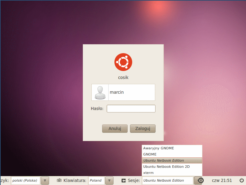Widać tutaj niestety pewne braki w lokalizacji, ale też dużą ilość obsługiwanych wariantów. Później konfigurujemy ustawienia sieci (ja wykorzystywałem połączenie przez Ethernet i nie wiem, czy możliwe jest użycie w tym procesie WiFi) i wybieramy lokalizację serwera z plikami. Następnym krokiem są odpowiedzi na pytania związane z ustawieniami zegara, partycjonowaniem dysku (tu proponowany jest ext4) i znacznie dłuższe już pobieranie podstawowego systemu (tutaj brakuje informacji o przewidywanym czasie całej tej operacji). Po wykonaniu tego konieczne jest podanie danych logowania użytkownika (nazwa i hasło) i wskazanie, czy jego katalog domowy ma być szyfrowany. Wtedy instalator wykonuje ulubione pobieranie kolejnej porcji plików (związane z konfigurowaniem menedżera pakietów apt)... Następnie wybieramy, czy aktualizacje mają być pobierane automatycznie i na dysku pojawiają się (cóż za zaskoczenie) kolejne porcje plików. Później decydujemy o tym, jakie grupy pakietów mają być pobrane. Ja wybrałem "Ubuntu Netbook" i wtedy można było już pójść na dłuższą kawę (tym razem od początku do końca pasek postępu jest z odliczaniem)... I wreszcie koniec - instalacja boot-loadera, konfiguracja zegara i prośba o wyciagnięcie płyty z napędu ŚrodowiskoPo starcie komputera wpierw wybieramy użytkownika, jego środowisko graficzne i podajemy hasło. Można również ustawić system tak, aby ktoś był logowany automatycznie.